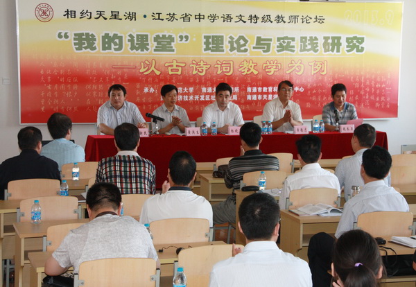 9月16日,天高气爽,丹桂飘香。在这美好的日子里,由江苏省教育厅教师培训中心主办历时两天的江苏省中学语文特级教师论坛在我们天星湖中学隆重举行。 16日上午8:00,来自全省近30位语文界的特级教师、学者、专家云集天星湖中学。8:30,“相约天星湖.江苏省中学语文特级教师论坛”开幕式正式举行。开幕式上,天星湖中学徐新民校长首先致辞,他代表全校2000余名师生热烈欢迎来自全省语文界的精英、专家,热烈祝贺江苏省中学语文特级教师论坛的召开,衷心感谢本届论坛对天星湖中学语文教学的促进和推动。之后,江苏师范大学黄德志教授、南通市教育局党工委杨晓岗书记、南通开发区社会事业局黄洪生局长致辞祝贺。 本届江苏省中学语文特级教师论坛的主题是“‘我的课堂’理论与实践研究——以古诗词教学为例”。据此,在论坛开幕式结束之后,我校语文学科组蒋竞群老师、薛永娟老师分别上了一堂古诗词教学研究课。