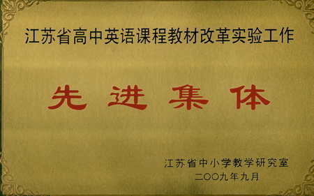 我校英语教研组喜获省课程教材改革先进集体称号 我校英语教研组长期以来十分重视英语课程教材改革,教师教得投入,学生学得轻松,在同类学校中,我校英语成绩一直名列前茅。近日,我校英语教研组喜获“江苏省高中英语课程教材改革实验工作先进集体”的光荣称号。愿英语组的老师们百尺竿头,更进一步。
