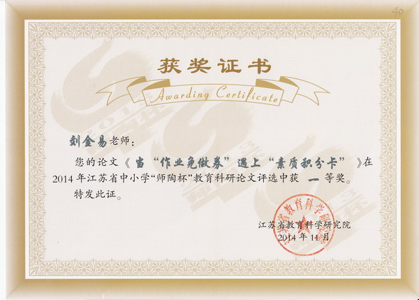 一等奖 刘金易《当“作业免做券”遇上“素质积分卡”》 二等奖 周怀凤《对陶行知“六大解放”教育主张的思考和探索》 周小兵《回归教育的原点— 生命关怀》 三等奖 吴 燕《高中数学教学中学生参与意识的培养与实践》 吴钰华《突破,从穿越时空开始——浅谈高中历史的课本剧教学设计》 |