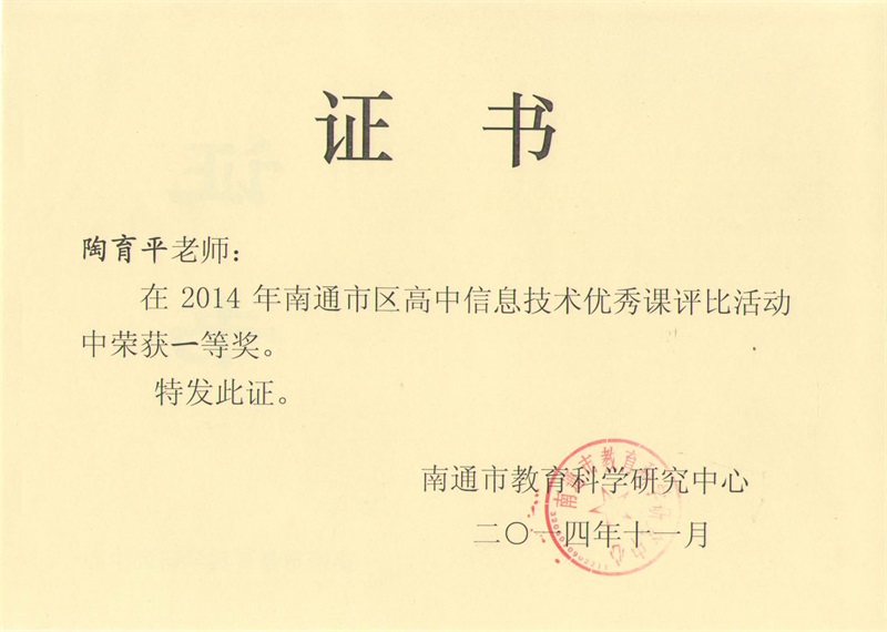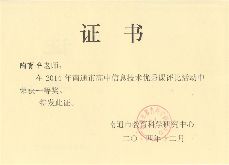 我校信息技术学科组陶育平老师在2014年度南通市区高中信息技术优课评比活动中,荣获一等奖第一名,她代表市区赴如东掘港高级中学参加南通大市的高中信息技术优课评比活动,凭借精心的课堂教学设计和优秀的课堂教学效果再次荣获一等奖的好成绩。