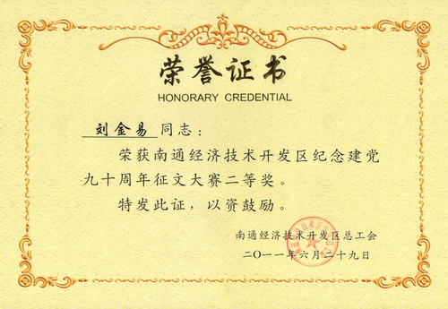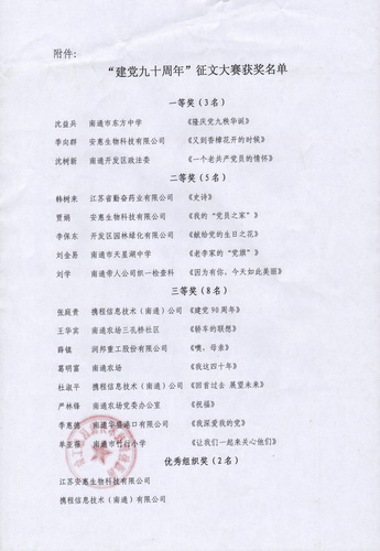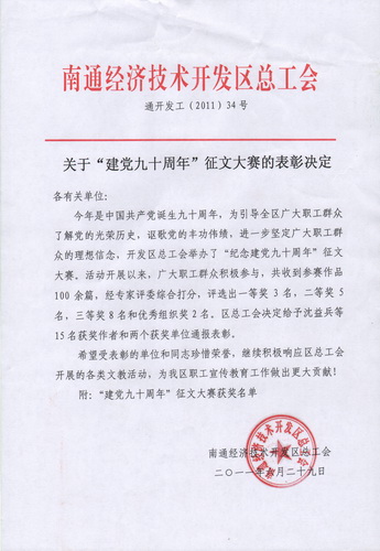 我校沈益兵主任、刘金易老师在不久前南通经济技术开发区总工会举行的“纪念中国共产党建党九十周年征文活动”中所撰写的《隆庆党九秩华诞》、《老李家的“党旗”》分别获得一、二等奖。
