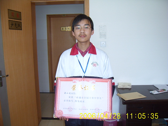 俞小龙同学被团市委授予“南通市十佳中学生”荣誉称号
