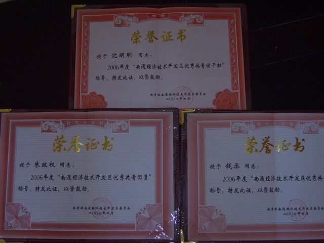 在今年的开发区"五四"表彰中,我校青年教师沈明明被授予"南通经济技术开发区优秀共青团干部"荣誉称号,朱政权 钱丞同学被授予"南通经济技术开发区优秀共青团员"荣誉称号.