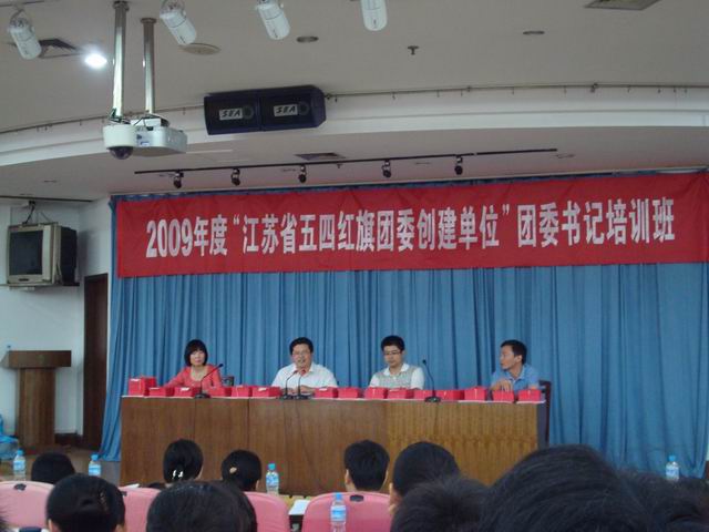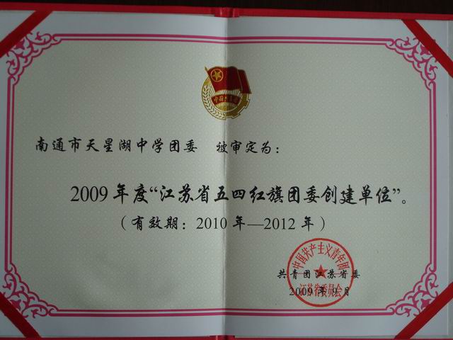 9月13日——15日,2009年度“江苏省五四红旗团委创建单位”团委书记培训班在江苏教育学院隆重举行,我校团委吴冬杰书记和来自全省各机关、乡镇、街道、企业、学校的220多位团委书记参加了此次培训。培训期间,团省委副书记沈海斌作了精彩动员,团省委组织部张薛锋作了团十六大以来团的重大理论建设专题辅导,团省委组织部一处处长郜虎林作了基层党建创新专题讲座,团省委宣传部副部长何敏作了团的基层组织建设专题辅导,全国五四红旗团委代表经验介绍。最后,经过严格考核,南通市天星湖中学调查被审定为:2009年度“江苏省五四红旗团委创建单位”。
