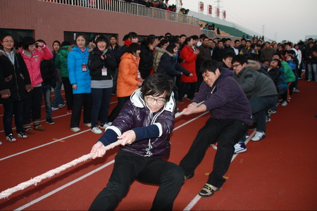 又到冬季“拔河”时 学生冬季拔河比赛是我校的传统项目。尽管严冬逞威,寒风肆虐,但拔河比赛的现场却是热情高涨,劲头十足。我校今年的冬季拔河比赛分预赛、决赛两次举行,高一、高二24个班级每班按男女比例各选20名身强力壮的同学参加角逐。 29日中午,冠亚军争夺战进入白热化,经过三轮比拼之后,冠军被高二9班夺得,高二5班获得亚军,高一12班取得第三名。