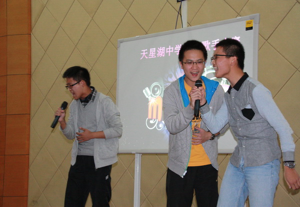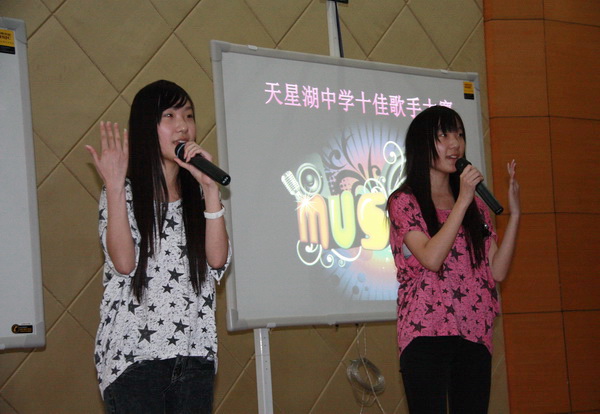 天星湖中学校园“十佳歌手”比赛经过前期激烈角逐选拔出二十组选手,10月26日晚于学校报告厅举行了紧张激烈而又欢快热烈的决赛。 6:30 比赛正式开始。音乐的细胞在选手们心中蠢蠢欲动,整个晚会流光溢彩。观众席上除了每个选手自带的后援团,班主任、家长也参与到比赛当中,所有人都因这场比赛而激动不已。 决赛选手们依次演唱《蝶恋花》、《老男孩》、《突然好想你》等耳熟能详的歌曲;高一(3)班陆思思一曲《叶子》用甜美的歌声将我们带入静谧的境界;高二(10)班耿啸又以《北京北京》向我们展示新一代学生对未来的向往;高二(2)班瞿阳的《新贵妃醉酒》将比赛推向高潮,亦真亦幻的男女声转换让观众如痴如醉。 好歌一首接着一首,高潮一个连着一个。这不仅仅是一场比赛,更是一场视觉的盛宴,听觉的享受。在跌宕起伏的歌声中,新一届天星湖中学校园“十佳歌手”新鲜出炉。同学们通过这个舞台,展现了自己的多才多艺,体现了多彩的校园文化。 本次校园“十佳歌手”决赛,我们请到了葛红军校长、黄夏炎主任、何国炎老师、沈亚威老师等担任评委。 校园十佳歌手及获奖情况: 一等奖:高一(2) 叶柔柔 二等奖:高一(8) 朱天琦 高一(11) 李煜欣 高二(2) 瞿 阳 三等奖: 高一(1) 朱一丹 高一(3) 季星童 高二(2) 耀杰靖组合 高二(2) 曹天琦 吴 真 高二(7) 姚紫欣 王紫悦 高二(12) 马鹏伟