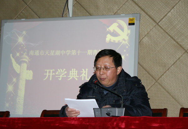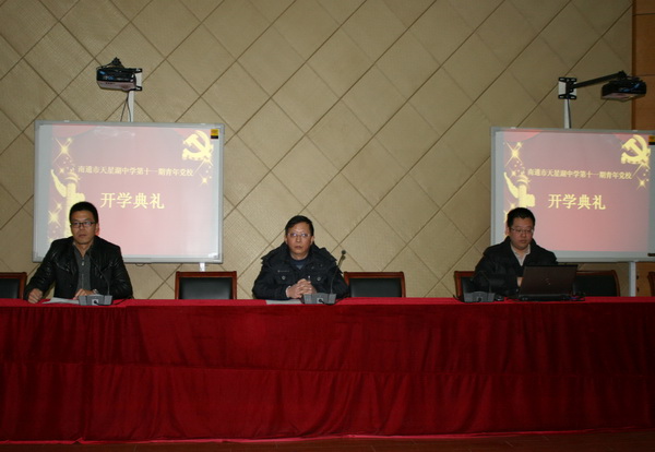 南通市天星湖中学第十一期青年党校开班典礼于12月22日下午在学校报告厅举行。来自全校的近两百位同学参加了此次培训。开班典礼由校团委书记吴冬杰主持;学校党总支副书记、副校长朱卫东发表了热情洋溢的讲话,他对我校青年党校的办学情况作了详细介绍,对学生入党的步骤作了详细说明,对此次培训提出了具体的建议和希望;开班典礼之后教务处赖军主任结合党的十八大,围绕《党章》的有关内容进行了辅导培训。 此次活动虽然时间不长,但是参与面广,学生学习热情高,认真程度好,同学们在积极向党组织靠拢的过程中迈出了坚实的一步。