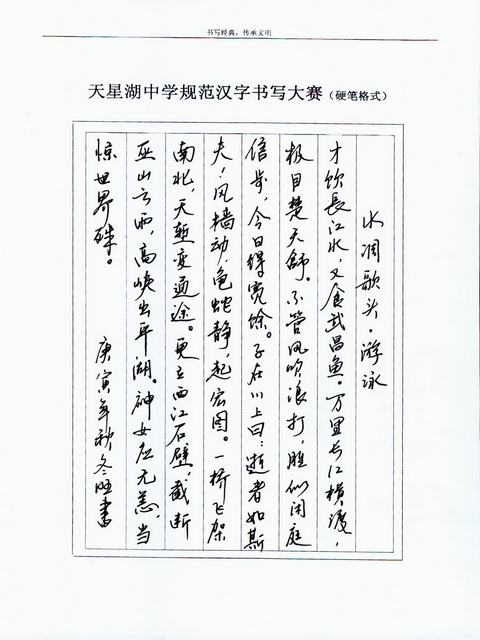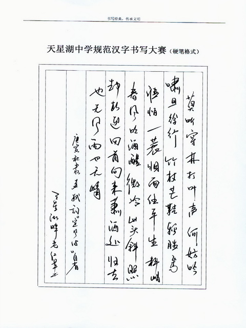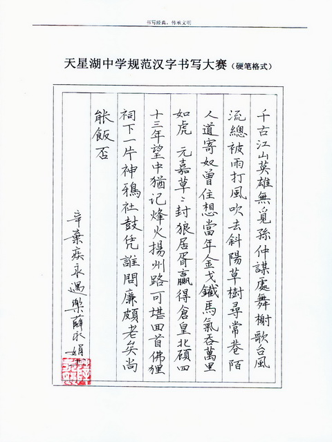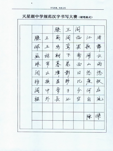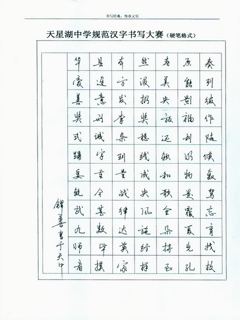 为打造“规范汉字书写教育特色学校”,我校工会与教务处于不久前联合举办了教师硬笔书法比赛。本次比赛,教师们参与热情高,投稿数量多。比赛组委会前后共收到硬笔书法稿件40余件。经过评审,结果已经揭晓。获得一等奖的同志分别是陈明华、陈锦善、葛红军、单冬旺、薛永娟、陈 杰。