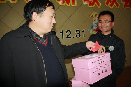 我校举行辞旧迎新联欢会 联欢会上,徐新民校长发表了热情洋溢的讲话。讲话回顾了一年来学校取得的成绩,展望了新的一年将要面临的挑战,最后祝愿广大教职员工新年快乐,万事如意。 联欢会上,四位音乐老师的献歌调动了现场的气氛,一轮一轮的抽奖活动更是将联欢会逐渐推向了高潮。在特等奖得主产生之后,联欢会也就进入了尾声。在大家的恋恋不舍中,联欢会落下了帷幕。