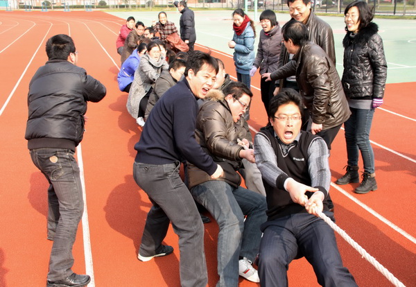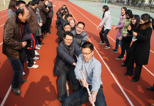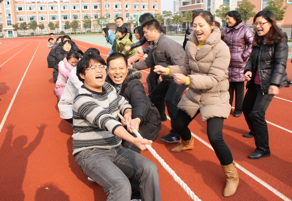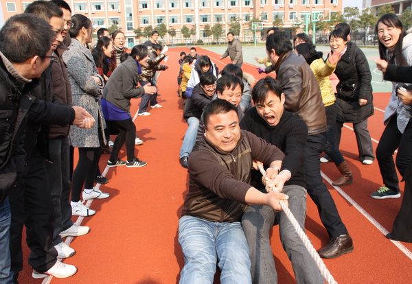 庆元旦系列活动之拔河比赛 教工拔河比赛分为高一、高二、高三、行政后勤四支参赛队,每队有8男7女组成。经过抽签,第一轮高一、高二相遇,高三、行政后勤组对峙。第二轮行政后勤组与高二争夺第三名,高一与高三决出冠亚军。最终高一年级组凭着坚强的毅力、团结一致的精神获得学校拔河比赛的冠军。 拔河比赛比的是力量,比的是技巧,也比的是团队协作精神。
