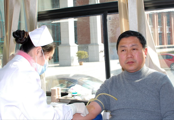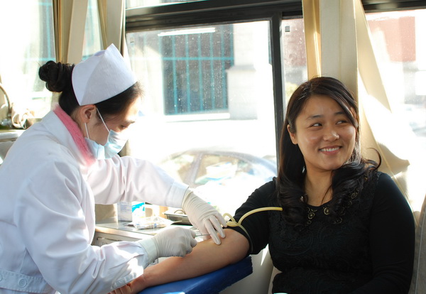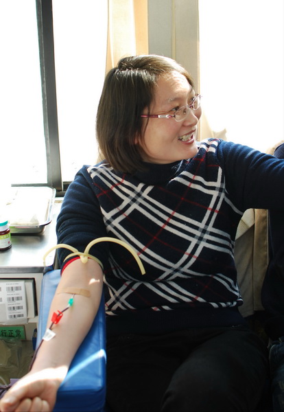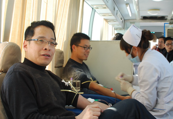无偿献血 无上光荣 第二天( 老师们静静地走进献血车,端坐在椅子上,然后熟练地挽起衣袖,当看到在护士的操作下自己殷红的鲜血慢慢流进专用血袋时,脸上露出的是欣慰的笑容。 义务献血已经成了天星湖中学的光荣传统,很多老师也已经多次献血,因为大家知道,我们献出的是可以再生的血液,而挽救的是不可再生的生命。