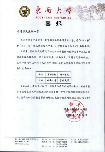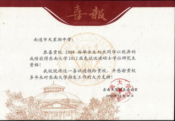 日前,东南大学招生办向天星湖中学发来喜报,恭喜我校2008届高三毕业生刘杰同学以优异成绩获得东南大学2012届免试攻读硕士学位研究生资格。 刘杰同学2008年6月于本校高中毕业,同年以高分录取东南大学材料科学与工程专业。据当年刘杰的班主任肖德 在此,我们衷心祝愿刘杰同学百尺竿头,更进一步,为母校争光,为祖国效力;同时也希望在校学子以刘杰为榜样,努力学习,早日成才。