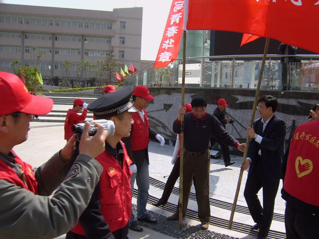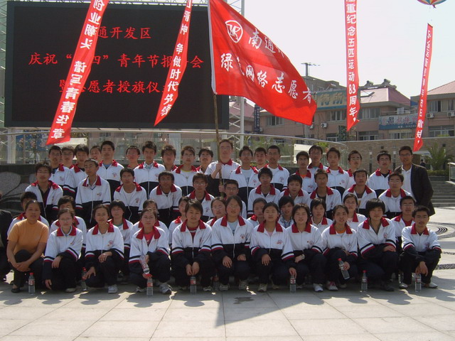 4月27日下午,南通开发区庆祝"五四"青年节报告会暨志愿者授旗仪式在开发区文化广场隆重举行,来自开发区各镇场街道各驻区单位的近400名志愿者参与了此次活动,我校派出了60多名学生志愿者参与活动. 大会期间,唐进华校长作为开发区志愿者代表作了精彩发言,团委吴冬杰书记接过了"绿色网络志愿者"的大旗.此次授旗仪式得到了团市委和开发区领导的关注与重视,在多方的积极参与与配合下取得了很好的效果,与此同时也拉开了开发区志愿者活动的序幕. |