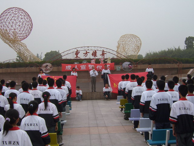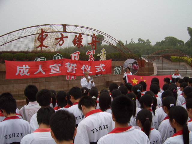 5月25日,天星湖中学高二年级学生在上海市青少年活动基地——东方绿舟举行了特别的十八岁成人宣誓仪式。面对鲜艳的五星红旗,同学们举起右手,庄严宣誓:我立志成为有理想、有道德、有文化、有纪律的社会主义公民。遵守宪法和法律,热爱社会主义祖国,拥护中国共产党的领导。正确行使公民权利,积极履行公民义务,自觉遵守社会公德。服务他人。奉献社会;崇尚科学,追求真知;完善人格,强健体魄,为中华民族的富强、民主和文明,艰苦创业,奋斗终生!带着兴奋,伴着激动,“我成人了”的欢呼声响彻在东方绿舟的上空。 |