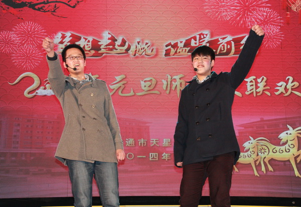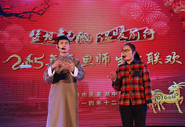 师生联欢 喜迎羊年 12月30日晚,南通市天星湖中学风雨操场内,笑语欢声,热闹非凡。天星湖中学全体师生2000多人齐聚一堂,举行一年一度的师生大联欢,喜迎2015年元旦。 整台晚会历时近三个小时,节目形式多样,丰富多彩,有小品、相声、歌舞、器乐表演、舞台剧等近20个节目。师生们用激昂的歌声表达了对生活的热爱,用优美的舞姿昭示了对未来的憧憬。节目进行过程中,导演组还插播了学校领导、教职工代表和往届优秀学子对天中祝福的视频!晚会高潮不断,精彩的表演赢得师生的阵阵喝彩和雷鸣般掌声。 南通经济技术开发区社会事业局邵平局长,带领事业局班子成员,全程观看了演出。邵局长对天星湖中学师生精彩的表现给予了高度评价,认为这台节目集中展示了开发区素质教育的新成果。演出结束后,邵局长一行走上舞台亲切慰问参演的师生,并与他们合影留念。 天星湖中学第七届家长委员会的委员也应邀观看了演出。