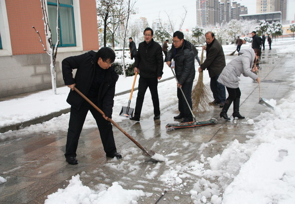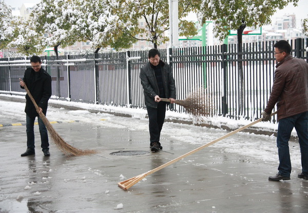 昨晚,一场纷纷扬扬的大雪如约而至。清晨,推开门窗,只见满世界银装素裹,天地相连。但难得一见的雪后美景并未让徐新民校长驻足欣赏,他首先想到的是校园安全,学生安全。 一清早,徐校长与当日的导护人员迎着还在飘飞的雪花和路面厚厚的积雪,早早地驱车来到校园,察看校园道路雪情,发布行走安全警示,布置清扫积雪任务。 一时间,学校所有中层以上领导和党员同志,有的拿着推耙,有的拿着铁铲,有的拿着扫帚,在学校主干道和人流量较大的路上纷纷推雪、铲雪、扫雪。尽管北风劲吹,天气寒冷,但高强度的体力活儿还是让大家汗水淋漓,不由得解开或者脱下了羽绒服。当大家看到原本平坦、宽阔的路面从厚厚的积雪中重又露出真容的时候,心中充满了胜利的喜悦。 校园里最早出来扫雪的人是食堂的陈师傅、马师傅。早晨6点,是寄宿生就餐的时间,两位师傅看到食堂四周道路被大雪覆盖,想到寄宿生出入食堂不便,甚至会发生危险,于是两人不等领导安排,就主动地在寄宿生进入食堂之前,把食堂主要出入口的路面积雪打扫干净,保证了寄宿生能安全通行。 一场大雪给了我们一片美丽景色,也展示了扫雪人的一种美丽心灵。