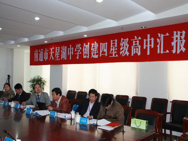 \ 25日上午8时,评估组专家首先观看了天星湖中学办学情况电视专题片,然后听取了天星湖中学校长徐新民同志关于学校创建四星级普通高中的进展过程以及天星湖中学近年来的办学情况和办学业绩的报告。 开发区党工委陈德新书记,管委会陈强副主任,南通市政府督导室秦建荣主任,南通市教育局基教处罗飞处长,开发区组织部王世瑞部长,党工委办公室王奇境主任,事业局黄洪生局长等领导也到会一并听取了徐新民校长代表学校所作的工作汇报。 汇报会在装饰一新的天星湖中学滋兰楼第一会议室举行。