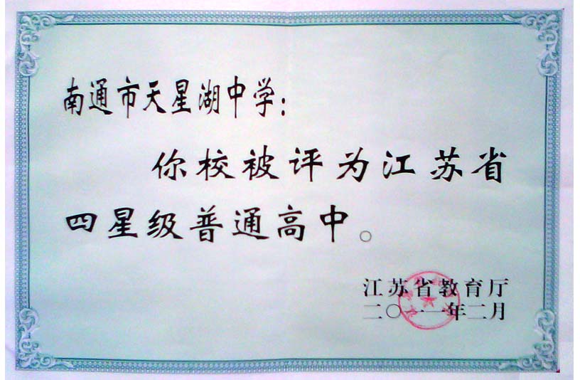 据江苏省教育厅公布的苏教基2011年12号文件,我校已成功晋升为江苏省四星级普通高中,从此开始迈入了省重点中学的行列。 学校的成功晋级,是南通经济技术开发区党工委、管委会长期以来重点扶持、正确引领的结果,是广大教职工员工辛勤工作、积极进取的结果,也是社会各界密切关心、鼎力相助的结果。对此,谨向为天星湖中学的建设和发展作出重大贡献的各级领导、各位老师、各界人士表示诚挚的感谢。 学校的成功晋级,对学校无疑是新的鞭策和激励。我们将以此为契机,直面新挑战,注入新活力,瞄准新目标,步上新台阶,凝聚全体天星湖人的智慧和力量,把天星湖中学真正办成市内有地位、省内有影响的一流的高级中学。